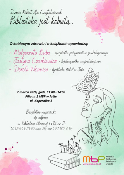 Może nie codziennie, ale jednak często, a w Dzień Kobiet z pewnością – Biblioteka jest kobietą! Z tej okazji zapraszamy nasze Czytelniczki na spotkanie 7 marca br. o 11:00 w Filii nr 2 przy ul. Kopernika 8. O kobiecym zdrowiu i kobiecych książkach opowiedzą Małgorzata Buba – specjalistka pielęgniarstwa ginekologicznego, Justyna Czerkiewicz – fizjoterapeutka uroginekologiczna oraz Dorota Woźnica – dyrektorka Miejskiej Biblioteki Publicznej w Jaśle.