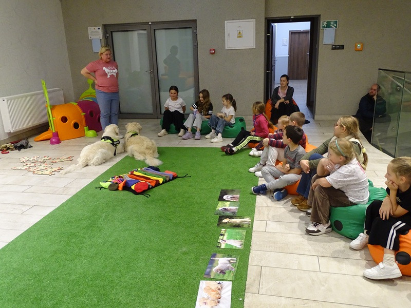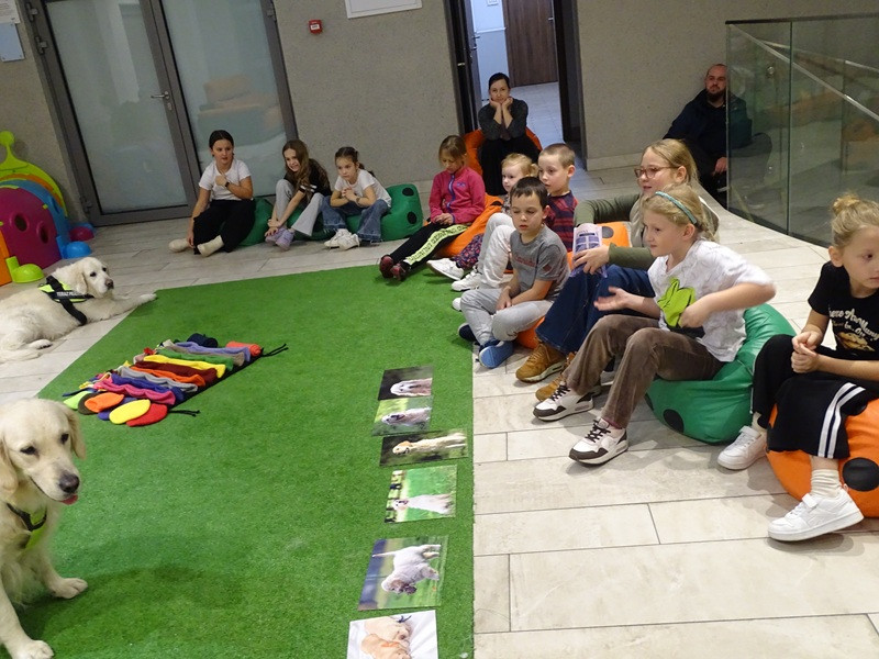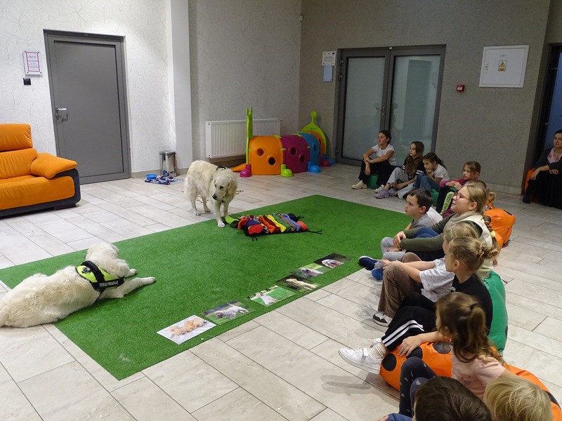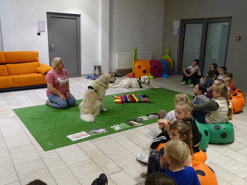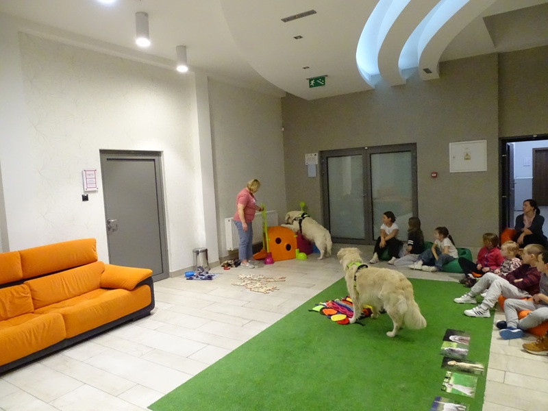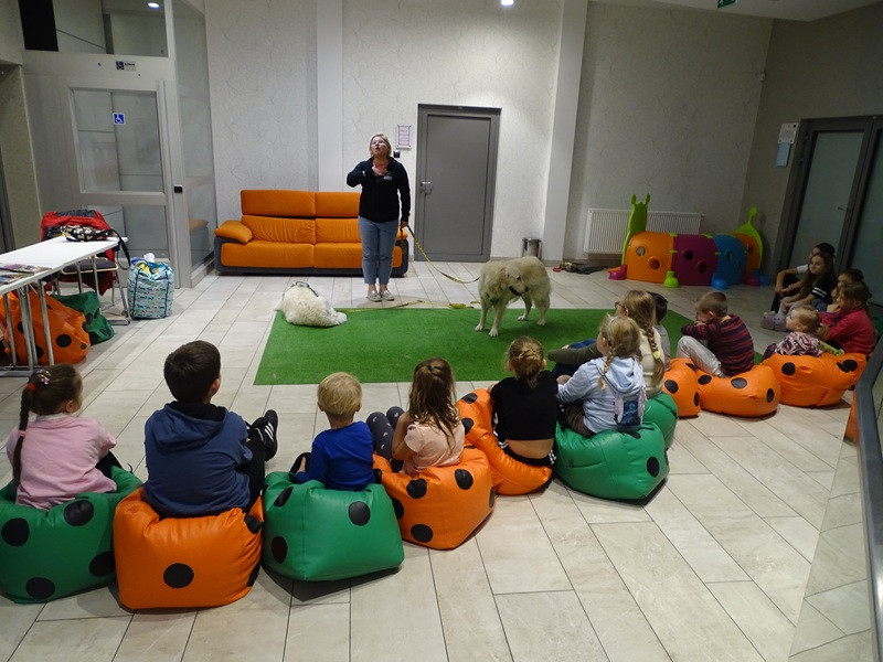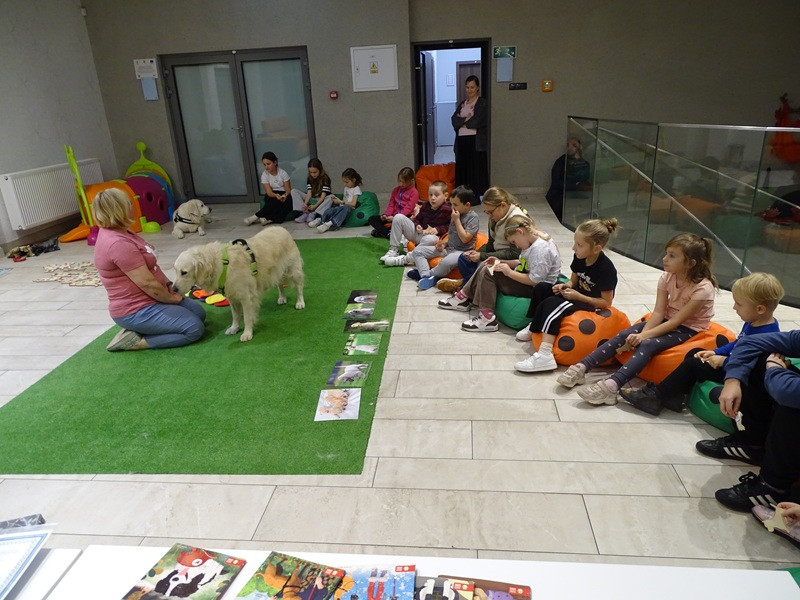 Młodzi czytelnicy licznie przybyli na spotkanie i wykazali się wielką ciekawością, zainteresowaniem poruszanymi tematami i zdyscyplinowaniem. Pierwsze spotkanie miało na celu naukę bezpiecznego zachowania w obecności psa, bezpiecznego kontaktu z psem, ustalenie i respektowanie granic i zasad pracy na zajęciach.