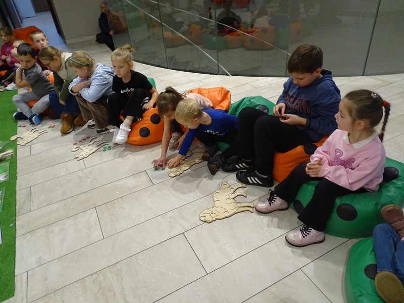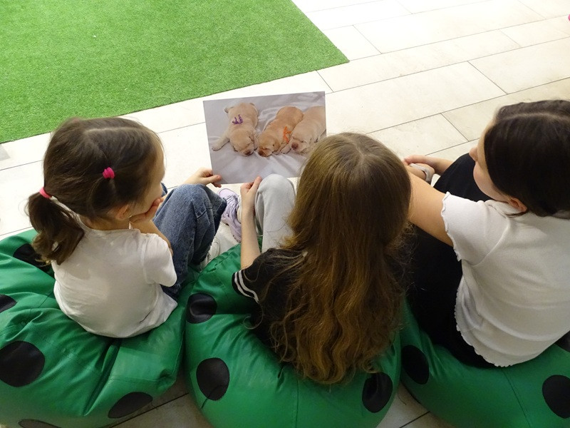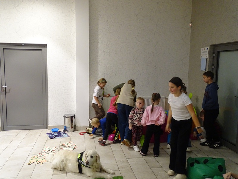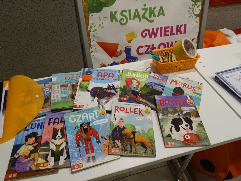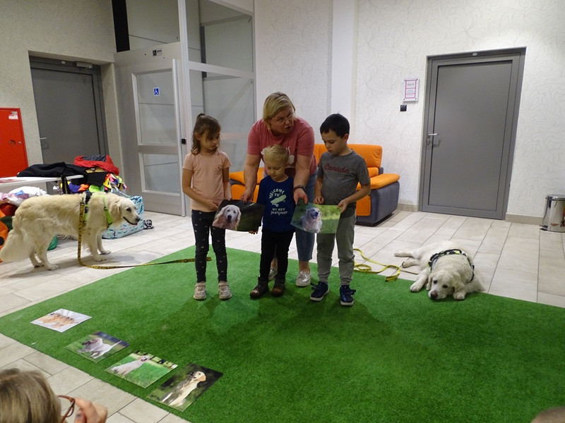 Był oczywiście czas na wspólną grę, przygotowanie maty węchowej i poszukiwanie ukrytych smaczków. Na zakończenie spotkania pani Jola zachęcała do wypożyczenia książek Barbary Gawryluk z serii Pies na Medal. Bohaterowie książek będą tematem następnych zajęć.
