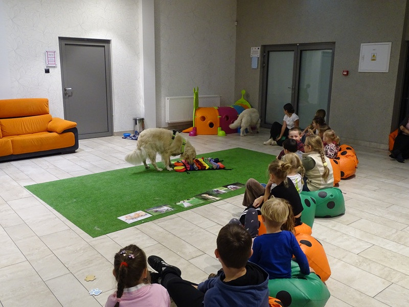 W ramach profilaktyki pogryzień dzieci zaznaczały na pomocach dydaktycznych, gdzie psy lubią być dotykane a gdzie nie akceptują dotyku oraz jak się z nimi komunikować. To była też piękna lekcja o tym, czego możemy nauczyć się od zwierząt – Alta i Aspen pokazały dzieciom, że pies akceptuje ludzi takimi, jacy są i kocha bezwarunkowo.