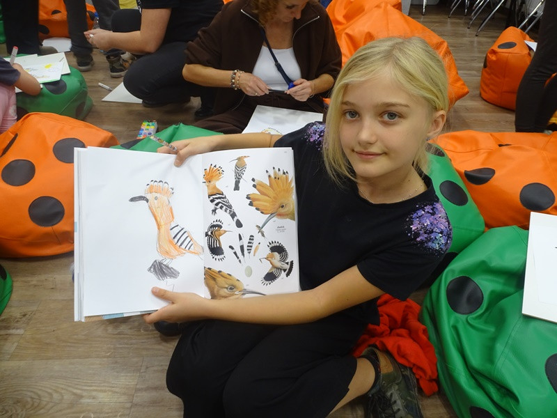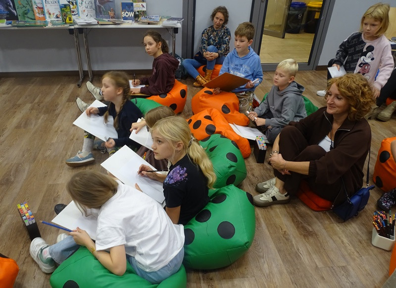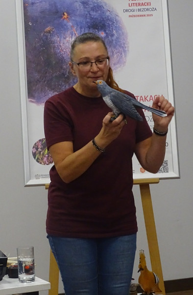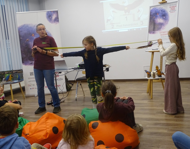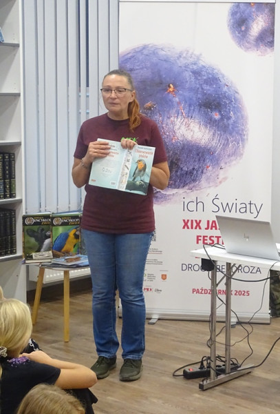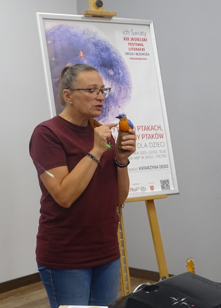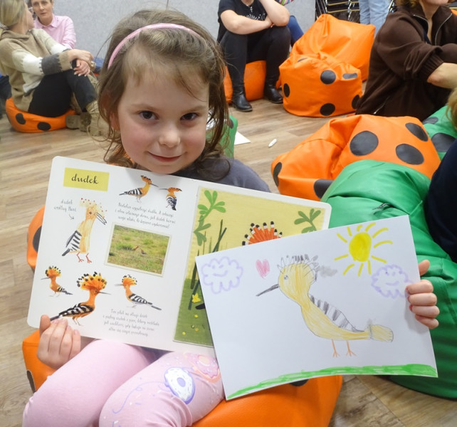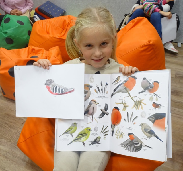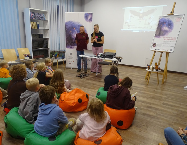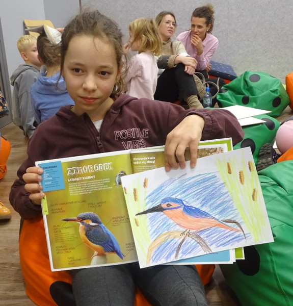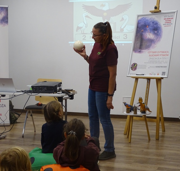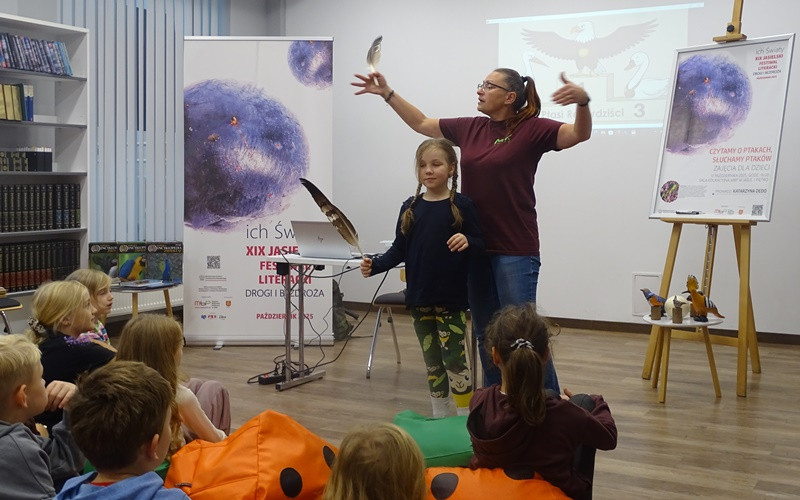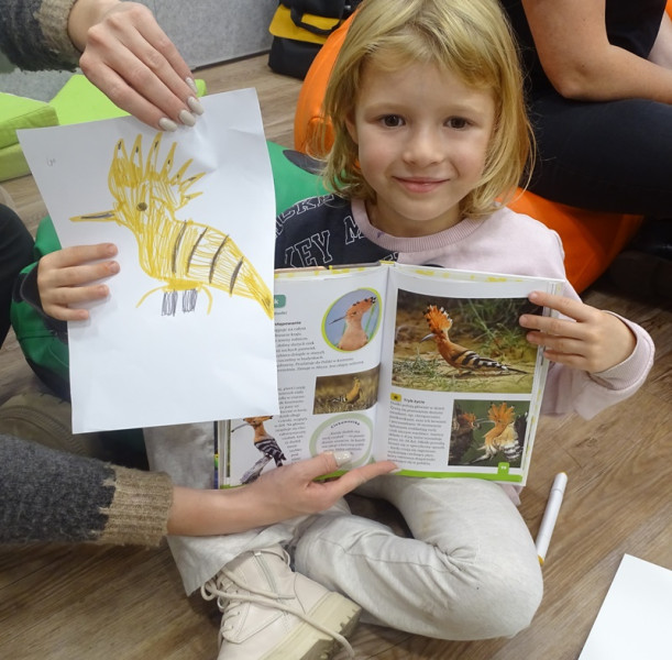 Katarzyna Dedo, edukatorka przyrodniczo-leśna w Ośrodku Edukacji Ekologicznej w Ożennej, z wielkim entuzjazmem dzieliła się swoją wiedzą o ptakach, opowiadając o ich zwyczajach, różnorodności gatunków i niezwykłych umiejętnościach. Wykorzystując fragmenty literatury przyrodniczej oraz rekwizyty, w ciekawy sposób przybliżała fascynujący świat skrzydlatych stworzeń. Za pomocą kolorowych ilustracji, modeli jaj i piór, pokazywała, jak różnią się ptaki pod względem wielkości, upierzenia, sposobu poruszania się czy odżywiania. Uczestnicy spotkania dowiedzieli się m.in., które ptaki potrafią biegać szybciej niż niejedno zwierzę! Nie zabrakło też przykładów rekordzistów – od ogromnego strusia po maleńkiego kolibra. Katarzyna Dedo zwróciła uwagę na to, jak ważne jest dbanie o ptaki i ich środowisko, i jak można im pomóc, zwłaszcza w czasach, gdy wiele gatunków traci swoje naturalne miejsca do życia z powodu działalności człowieka. W trakcie warsztatów edukacyjnych dzieci namalowały ptaki, które poznały podczas spotkania, by następnie w atlasach odnaleźć narysowane gatunki. Dzięki temu utrwaliły sobie nazwy i wygląd ptaków oraz miejsca, gdzie można je spotkać.