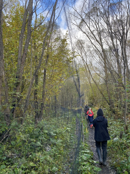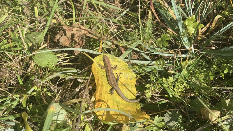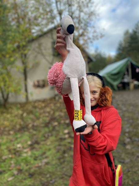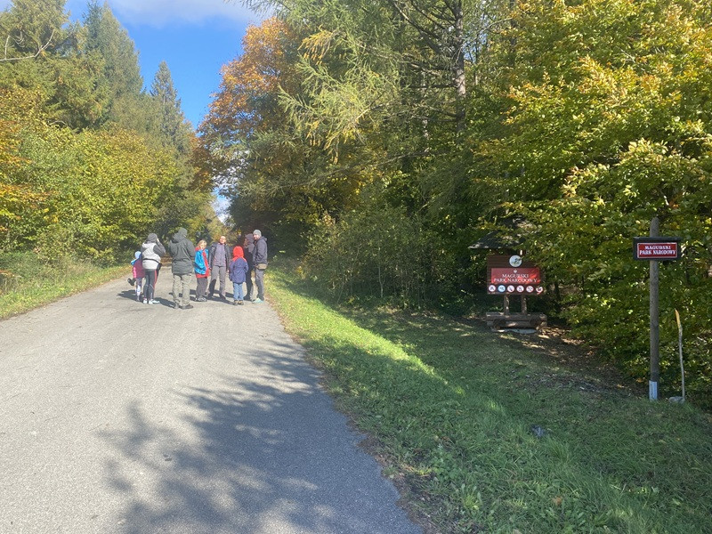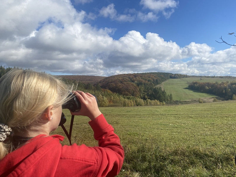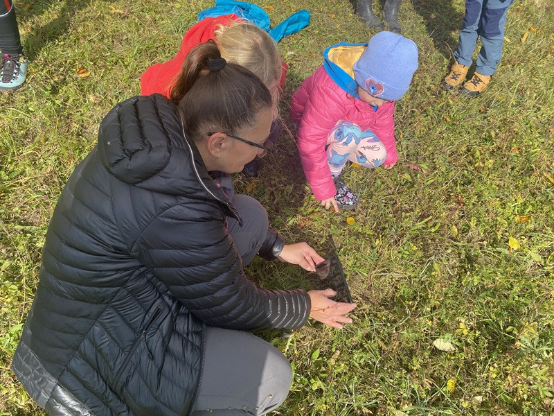Następna część spaceru odbyła się w Ożennej. Uczestnicy wyruszyli w teren, by korzystając z pięknej pogody obserwować rośliny, owady, ptaki i inne zwierzęta. A było ich mnóstwo! Dziecięca bystrość i uważność sprawiła, że przenosząc wzrok z gąsieniczki przechodzącej przez drogę na latające nad polaną kruki, uczestnicy wypatrzyli wilka, w na tyle bezpiecznej odległości, że mogli przez długą chwilę swobodnie go obserwować i podziwiać. Były też biedronki, jaszczurki, chrząszcze, sarny, a nawet wygrzewająca się w jesiennym słońcu żmija zygzakowata.