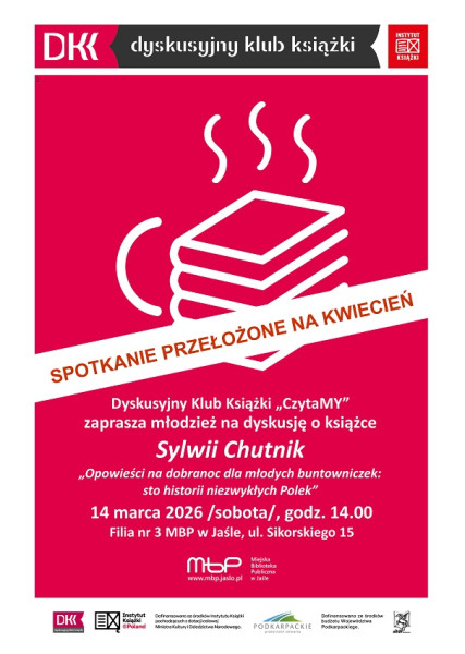 Dyskusyjny Klub Książki „CzytaMY” zaprasza młodzież na spotkanie 4 marca 2026 r. (sobota) o godz. 14:00 do Filii nr 3 Miejskiej Biblioteki Publicznej w Jaśle. Będziemy dyskutować o książce Sylwii Chutnik „Opowieści na dobranoc dla młodych buntowniczek: sto historii niezwykłych Polek”.