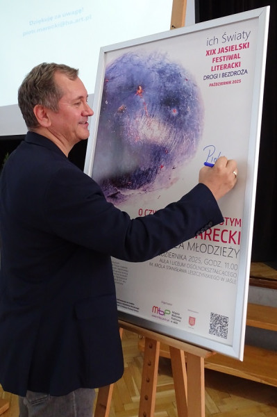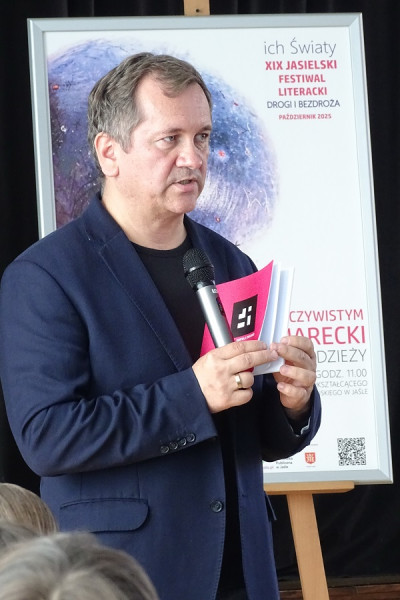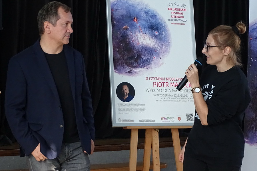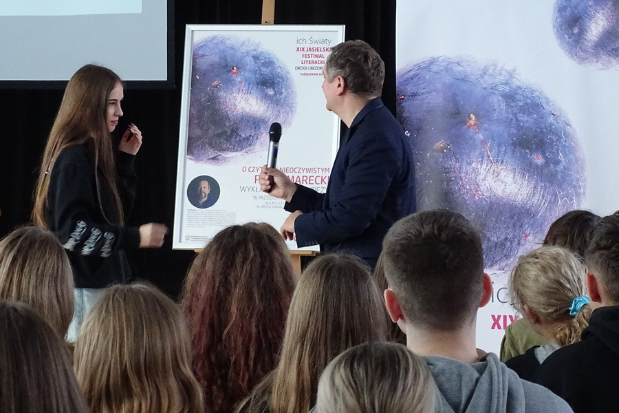 16 października 2025 roku, przed południem, Piotr Marecki spotkał się z młodzieżą z I Liceum Ogólnokształcącego w Jaśle. Podczas swojego wykładu „O czytaniu nieoczywistym” mówił o literaturze eksperymentalnej, w której czytelnik nie jest biernym odbiorcą, lecz musi współtworzyć sens – interpretować, łączyć fragmenty, odkrywać ukryte znaczenia. Jej celem jest pokazanie nowych sposobów opowiadania o świecie i doświadczeniu człowieka. Autorzy eksperymentalni traktują tekst jak laboratorium języka i formy, gdzie można sprawdzać, jak daleko da się przesunąć granice literatury. Piotr Marecki wybrał i omówił kilka przykładów utworów łamiących tradycyjne zasady pisania, narracji i formy: „Zniknięcia” Georges'a Pereca z całkowitym pominięciem litery "e", „Eunoia” Christiana Böka, w którym każdy rozdział jest napisany przy użyciu słów ograniczonych do spółgłosek i jednej samogłoski, „Port hwjezdny Topjo” Harry Josephine Giles, w tłumaczeniu Krzysztofa Bartnickiego (1971), który mieszankę językową oryginału (orkadzki / szkocki / angielski), przełożył używając polskich dialektów Pomorza i okolic, „Między kartką a ekranem” Amaranth Borsuk, którą możemy przeczytać dopiero po uruchomieniu aplikacji cyfrowej.